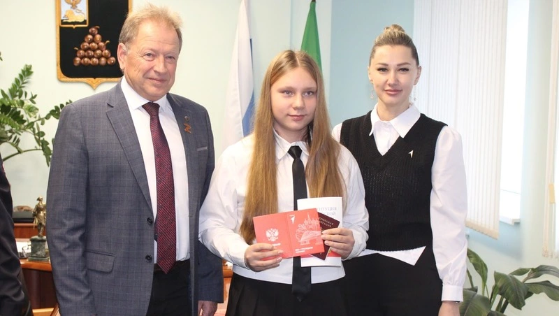 Молодые граждане России в этот знаменательный день получили подарки – Конституцию Российской Федерации, а также обложки на паспорт и значки от «Движения Первых». Все желающие по традиции смогли посидеть в кресле руководителя администрации. В том числе и ученица 8 класса первой городской школы Анастасия Головина.